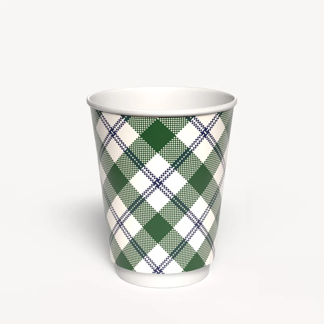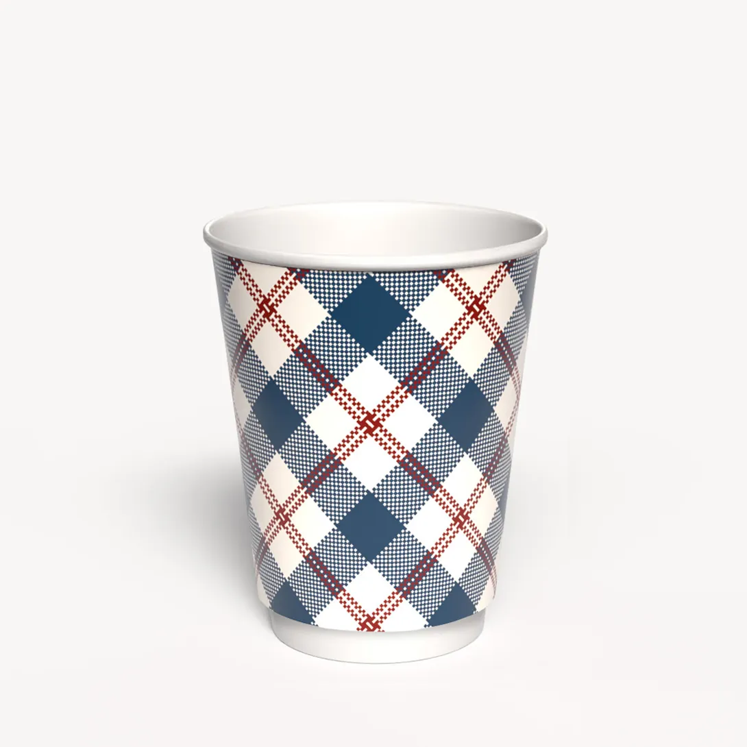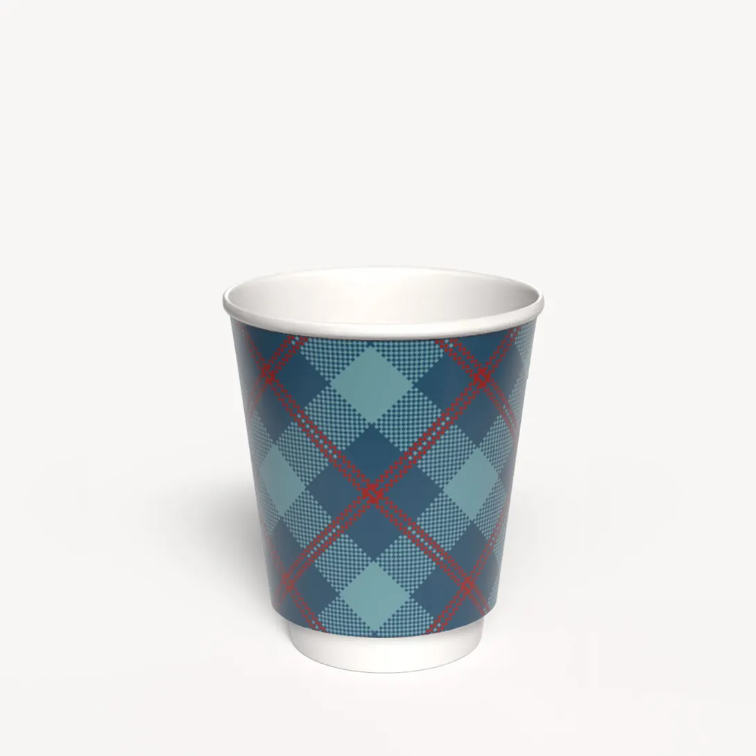 Dwuwarstwowy kubek w pięknych kolorach w kratę, idealny do ciepłych napojów. Pomiędzy ściankami pusta przestrzeń chroniąca przed poparzeniem.