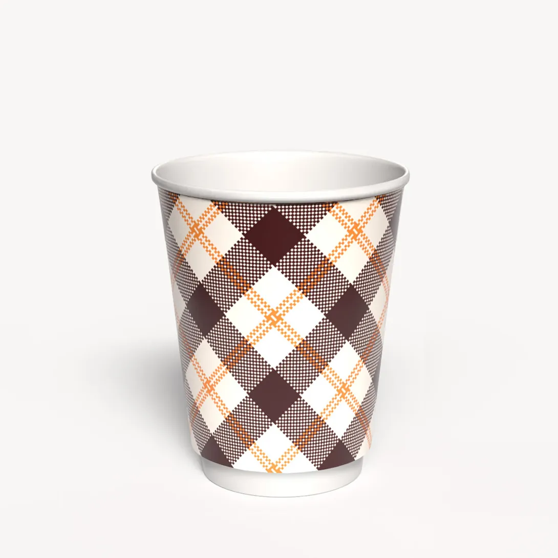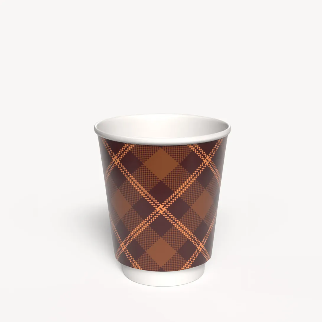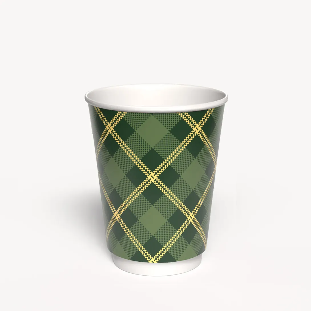 Dwuwarstwowy kubek w pięknych kolorach w kratę, idealny do ciepłych napojów. Pomiędzy ściankami pusta przestrzeń chroniąca przed poparzeniem.